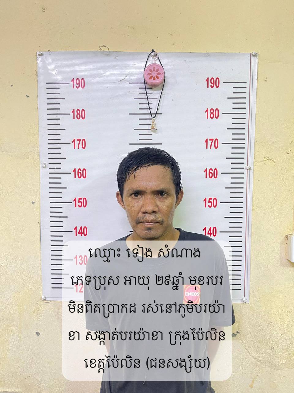ប្រភពព័ត៌មានបានឱ្យដឹងថា កាលពីថ្ងៃទី១៤ ខែវិច្ឆិកា ឆ្នាំ២០២៥ វេលាម៉ោង៣:៣០នាទីរសៀល កម្លាំងនគរបាលចំណុះអង្គភាពនៃអធិការដ្ឋាននគរបាលក្រុងប៉ៃលិនតាមមុខសញ្ញាដែលប្រព្រឹត្តបទល្មើសមានឈ្មោះ ទៀង សំណាង ភេទប្រុស អាយុ២៩ឆ្នាំ មុខរបរមិនពិតប្រាកដ រស់នៅភូមិបយ៉ាខា សង្កាត់បយ៉ាខា ក្រុងប៉ៃលិន ខេត្តប៉ៃលិនបានដេញដល់ចំណុចផ្លូវបែកជាបួនត្រង់ចំណុចចំការកាហ្វេស្ថិតក្នុងភូមិអូរច្រាកើត សង្កាត់ទួលល្វា ក្រុងប៉ៃលិន ខេត្តប៉ៃលិន។ ប្រភពបន្តទៀតថា ភ្លាមៗនោះកម្លាំងសមត្ថកិច្ចក៏បានកាក់មុខសញ្ញានេះឱ្យឈប់ដើម្បីសួរនាំតែជនសង្ស័យមុខសញ្ញានេះមិនព្រមឈប់ម៉ូតូនោះទេ ដោយបានជិះម៉ូតូក្នុងល្បឿនលឿនបំបុកទៅលើសមត្ថកិច្ចនគរបាលគឺលោកវរសេនីយ៍ត្រី សឿ ឡងឌី នាយប៉ុស្តិ៍នគរបាលរដ្ឋបាលប៉ៃលិនបណ្តាលឱ្យរងរបួសចំស្មងជើងខាងស្តាំ (ដេរអស់ចំនួន៥ថ្នេរ)។ ប្រភពដដែលបានបញ្ជាក់ទៀតថា ក្រោយពីបុកជនរងគ្រោះរួចក៏ដួលម៉ូតូ ដោយជនសង្ស័យរត់ចូលទៅក្នុងព្រៃត្រូវបានកម្លាំងសមត្ថកិច្ចនគរបាល និងប្រជាពលរដ្ឋតាមចាប់ឃាត់ខ្លួនបានតែម្តង។